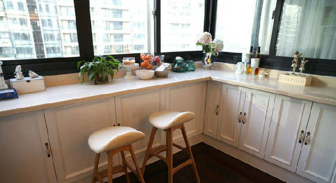 餐厅左边的阳台对着中庭花圃,就打造了个早餐台,台面往外伸出15公分。在这儿喝喝茶、吃早点、上上网,坐在高脚凳上刚好能看到小花圃的风景。