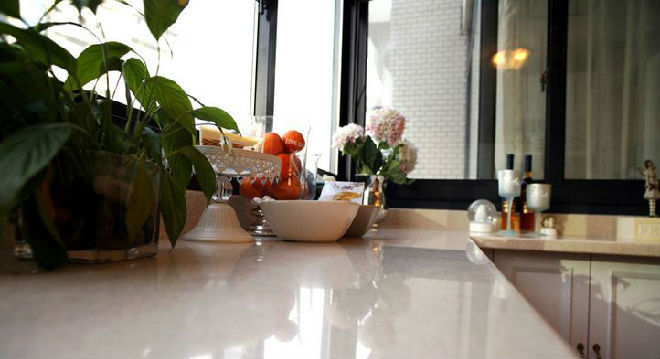 厨房和早餐台的石英石台面采取了入口的,目下住的厨房的石英石台面照旧留了好多污渍,但愿这个能保抓得长久些