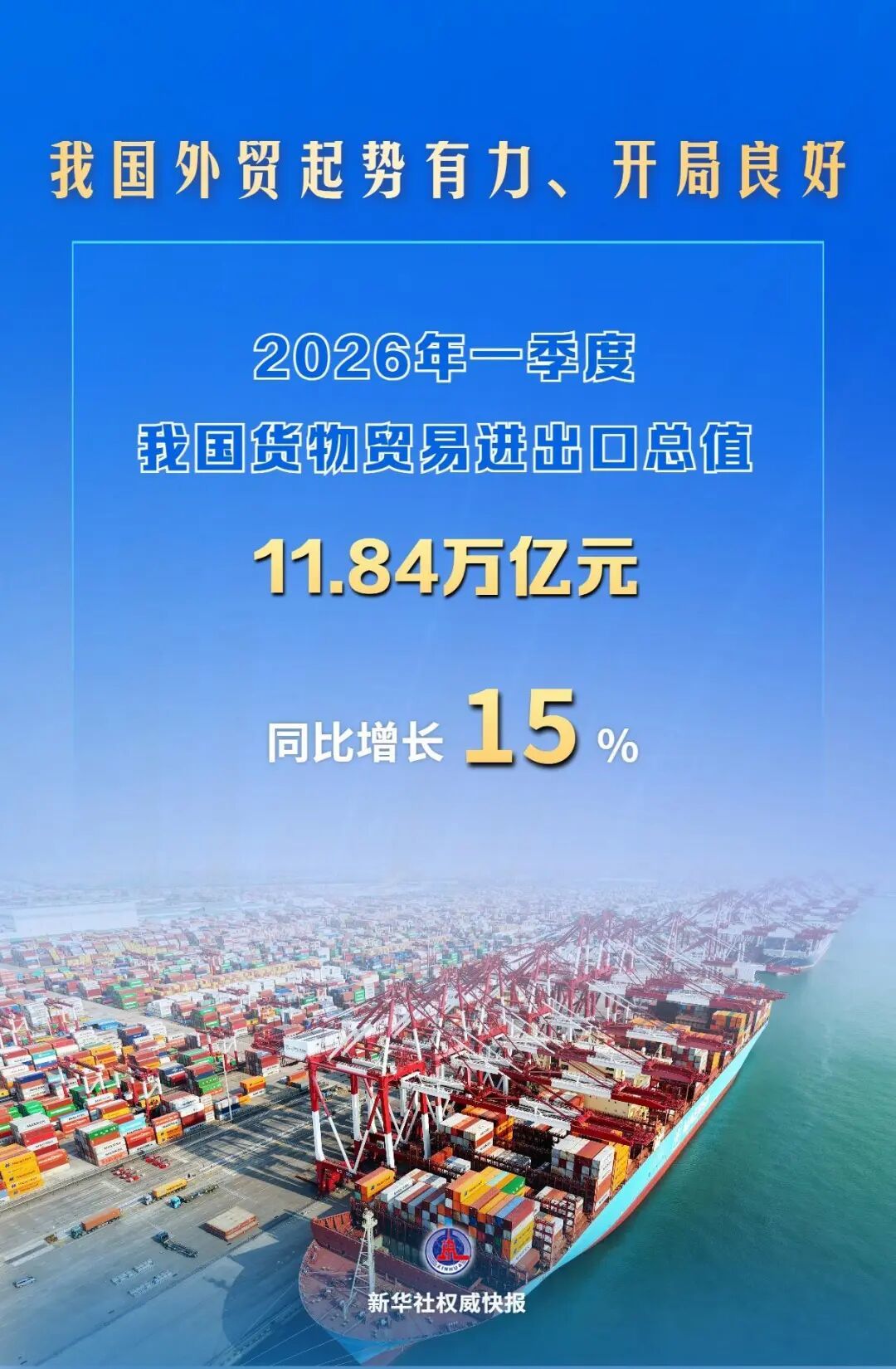 海关总署4月14日发布数据泄露,2026年一季度我国货色生意出进口总值11.84万亿元,历史同时初次超过11万亿元,同比增速保合手两位数增长,达到15%。