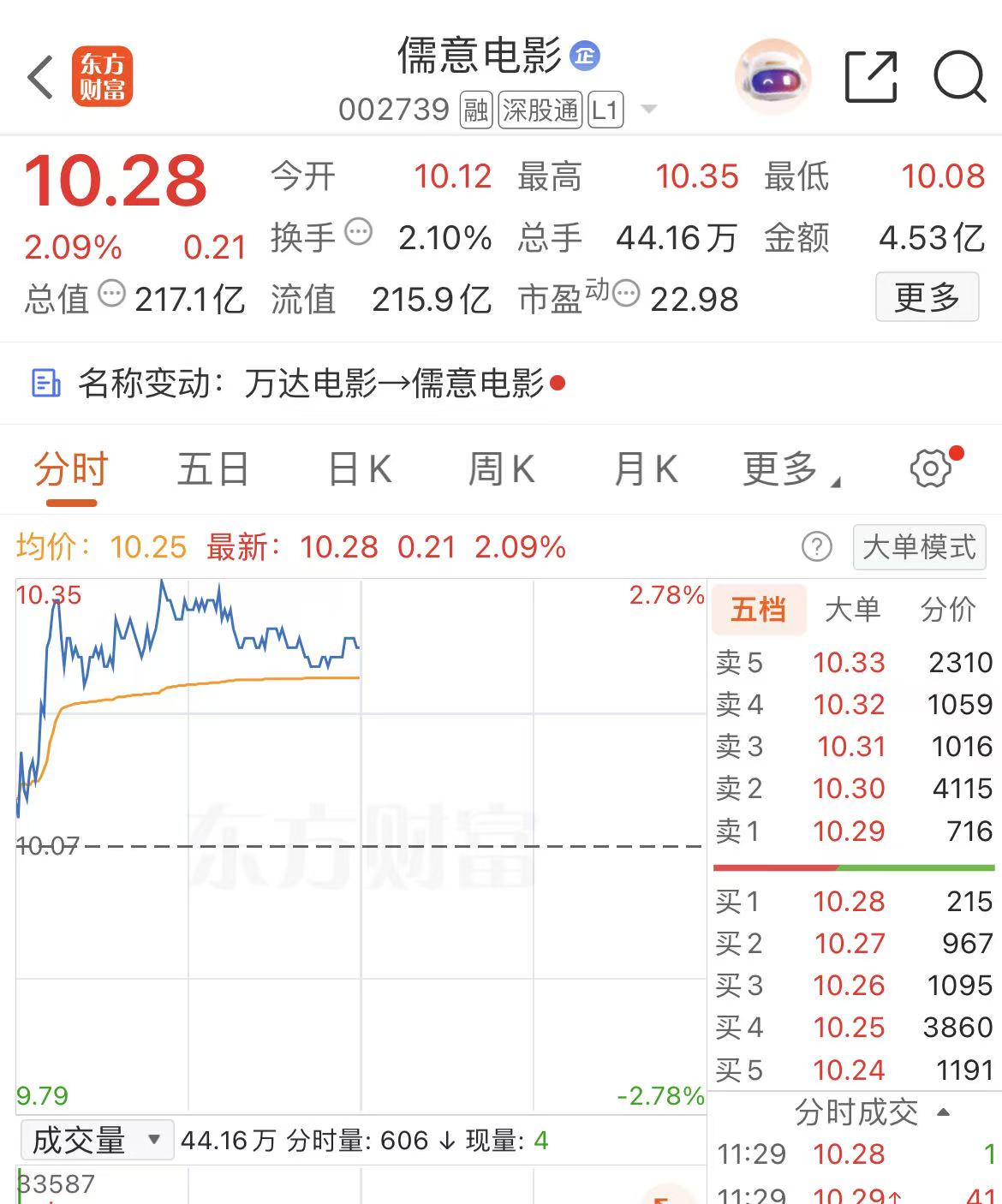 成本市集对此反映积极。4 月 20 日开盘后,儒意电影股价稳步高潮,甘休当天午盘收盘,股价报 10.28 元 / 股,涨幅 2.09%,公司总市值达 217.1 亿元。